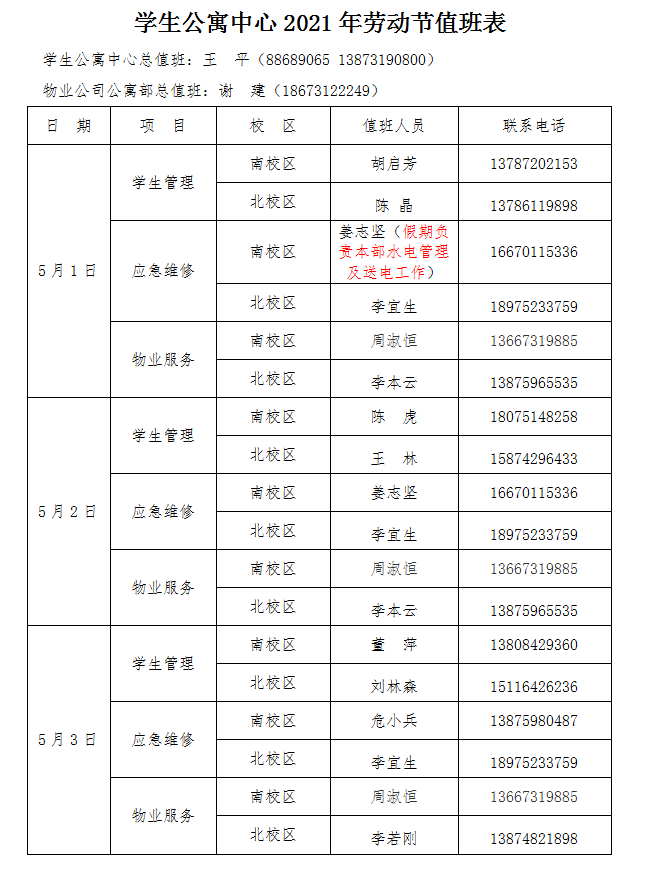 根据校办《关于2021年劳动节放假安排的通知》(校办发〔2021〕3号)的安排,结合工作实际,现就学生公寓中心2021年劳动节值班作如下安排: