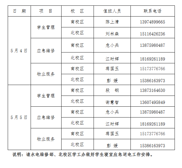 三、水电维修部、北校区学工办做好公寓水电管理和寝室送电、维修服务等值班人员安排,确保学生公寓日常生活和水电供应。